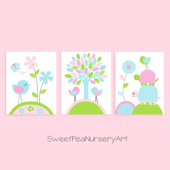 Aqua Green Pink Nursery Art Bird Nursery Girl Turtle Print Etsy